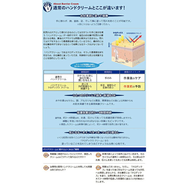 「バリアクリーム」であるケロデックスは、そうした悪循環を断ち切るため、お仕事前に塗っていただき、刺激物から皮ふを保護することを目的としています。